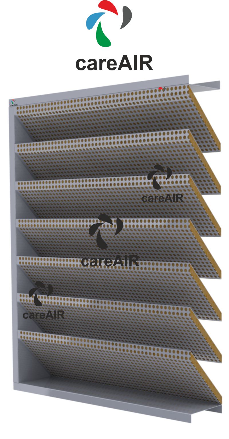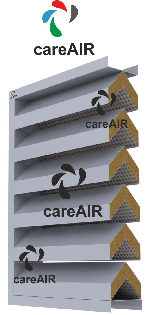 Acoustic louvres with inverted V-shaped blades in HVAC systems are specialized air distribution components designed to allow airflow while minimizing the transmission of noise between spaces or from HVAC equipment to the surrounding environment. The inverted V-shaped blades are arranged to enhance sound attenuation by creating a more complex path for sound waves, effectively reducing noise levels without significantly impeding airflow. The blades are shaped in an inverted "V" configuration, which enhances acoustic performance by reflecting and absorbing sound waves as they pass through the louvre. These louvres may have additional sound-absorbing materials, such as acoustic foam or fiberglass, within the blade or cavity structure. The V-shaped design increases the surface area for sound absorption and interrupts the direct path of sound waves, leading to significant noise reduction. Effective at controlling both low and high-frequency sounds.